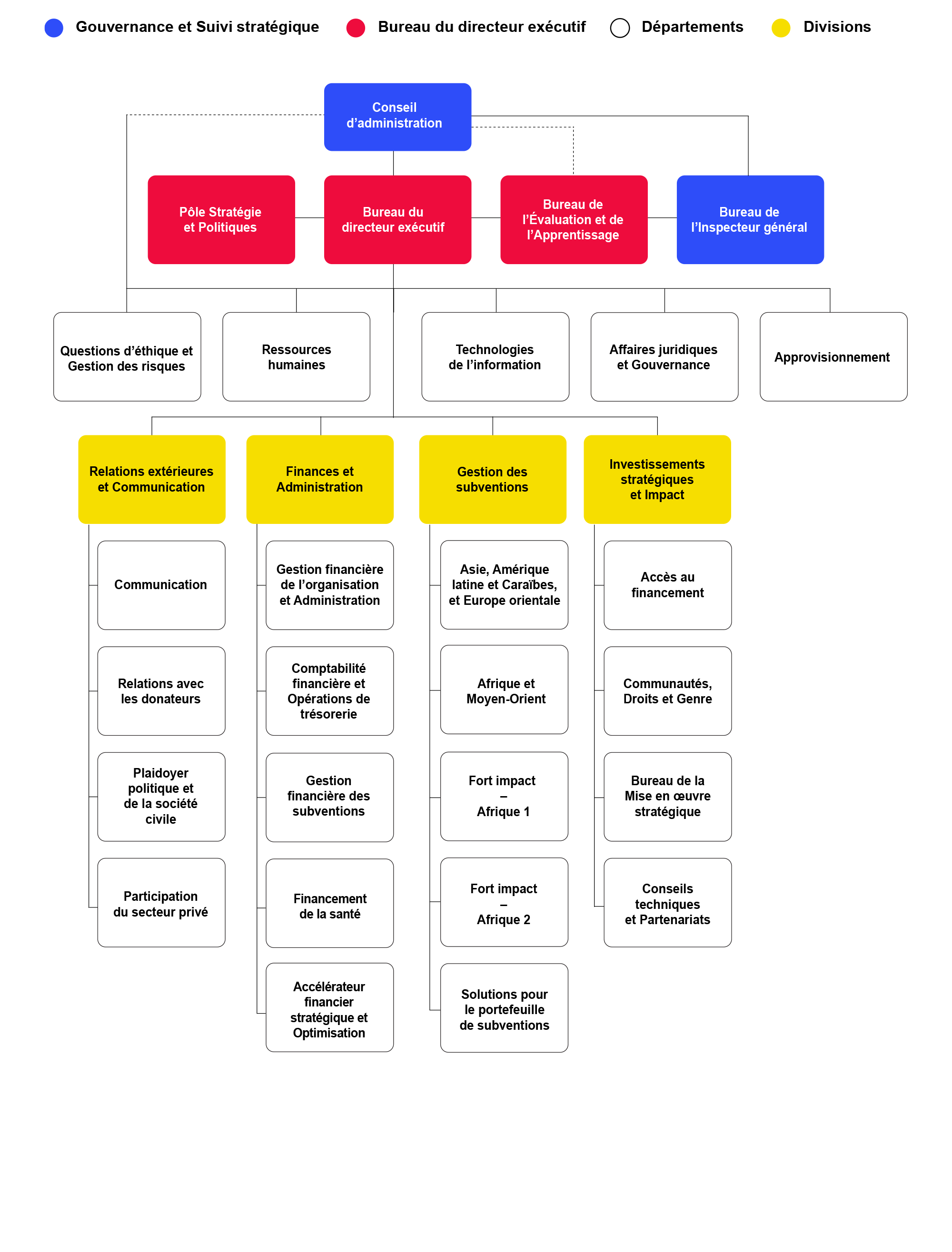 Le Bureau de l’Inspecteur général est indépendant du Secrétariat du Fonds mondial, même si les deux ont leurs bureaux au même endroit. L’Inspecteur général rend compte directement au Conseil d’administration du Fonds mondial, tout comme le Directeur exécutif.